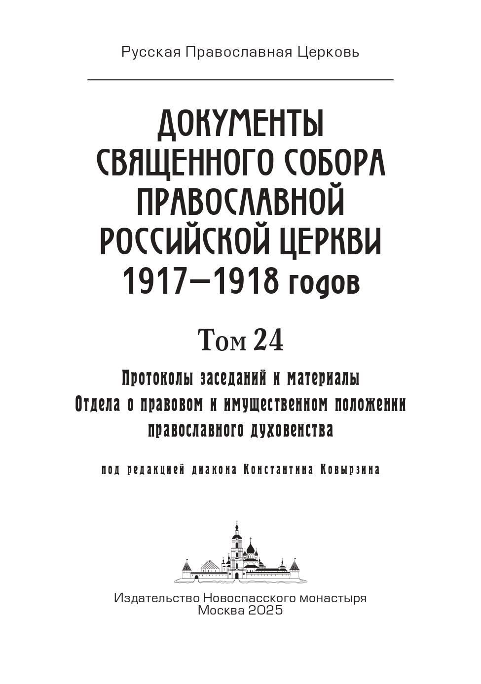 В двадцать четвертом томе научно-академического издания документов Священного Собора Православной Российской Церкви 1917-1918 гг. публикуются документы соборного Отдела о правовом и имущественном положении православного духовенства. В книге собраны протоколы его заседаний, итоговые документы, переданные на рассмотрение общего собрания Собора, дополнительные материалы, связанные с его деятельностью. Работа данного Отдела пока мало изучена, материалы его практически неизвестны; между тем они содержат ценные сведения для изучения экономического положения, социокультурного облика, менталитета и самосознания православного приходского духовенства в революционную эпоху. Том снабжен вступительной статьей, комментариями и справочным аппаратом. Все включенные в состав тома документы публикуются впервые.